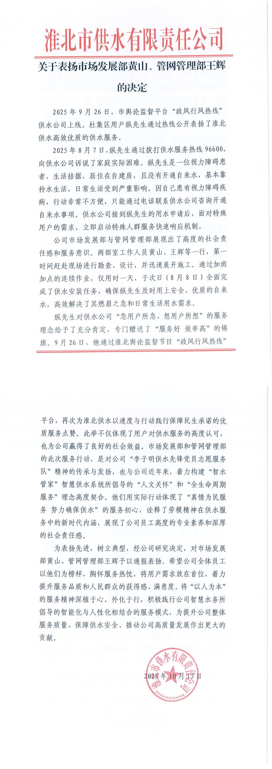 關于表揚市場發展部黃山、管網管理部王輝的決定